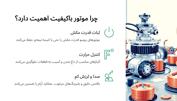 ۲. کنترل حرارت: موتورهای ضعیف به دلیل آلیاژهای نامناسب در هسته و سیمپیچ، سریع داغ میکنند. این حرارت به لاک سیمها آسیب میزند و باعث تغییر شکل بدنه پلاستیکی جاروبرقی، ذوب شدن فیلترها و خرابی بردهای الکترونیکی میشود.